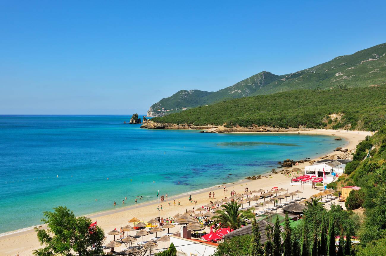 Praia de Galápos is a picturesque cove tucked along the Arrábida coast, offering clear turquoise waters and golden sand sheltered by high cliffs. It’s slightly larger than its famous neighbor Galapinhos, yet it still feels intimate and charming. The calm, translucent water here is fantastic for swimming – even a quick dip will refresh you on a hot day. Many also bring snorkel gear to peek at small fish near the rocky edges. Galápos has the conveniences that day-trippers appreciate: in summer you’ll find lifeguards on duty, a handy beach bar/restaurant for cold drinks and lunch, and sun umbrellas for hire dotting the shore. These amenities, coupled with the stunning view of the Arrábida hills meeting the sea, make it a perfect blend of comfort and natural beauty.