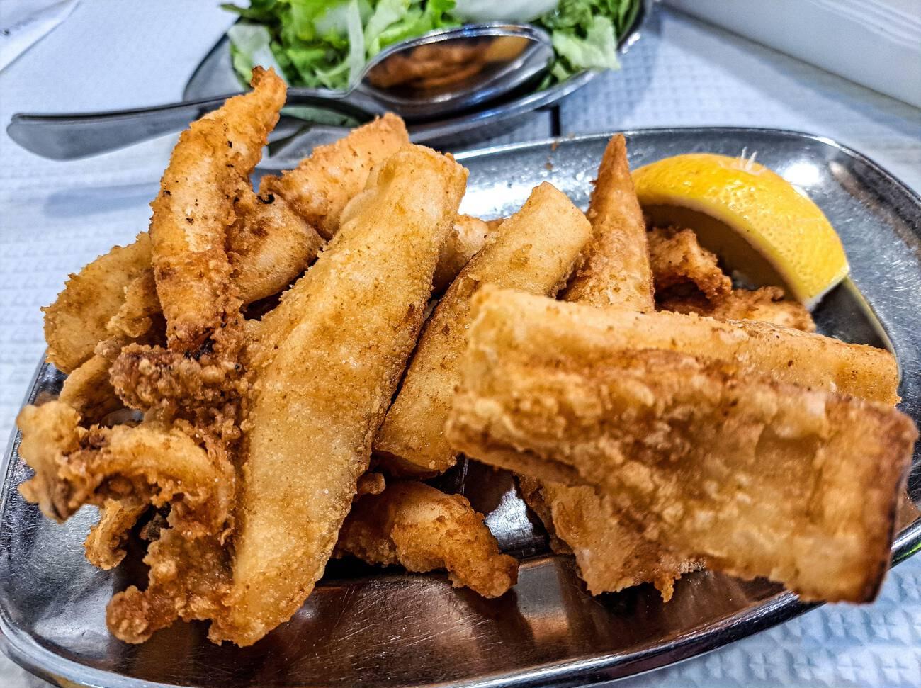 Choco frito is a traditional dish made from cuttlefish that is cleaned, cut into strips, marinated and deep-fried until golden. It is typically served with french fries, salad and fresh lemon. Although often compared to fried calamari, choco frito has a firmer texture and a more pronounced flavor profile.